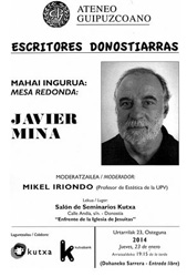 El escritor navarro afincado en San Sebastián, Javier Mina, protagoniza una mesa redonda en el Ateneo Guipuzcoano. El acto estará moderado por el profesor de estética de la UPV, Mikel Iriondo.