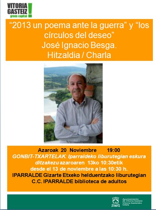 Presentación de las últimas obras de este escritor vitoriano que hablará del proceso de escribir una novela o poesía teniendo una profesión alejada de este campo. Miércoles 20 noviembre de 2013. a las 19.00.