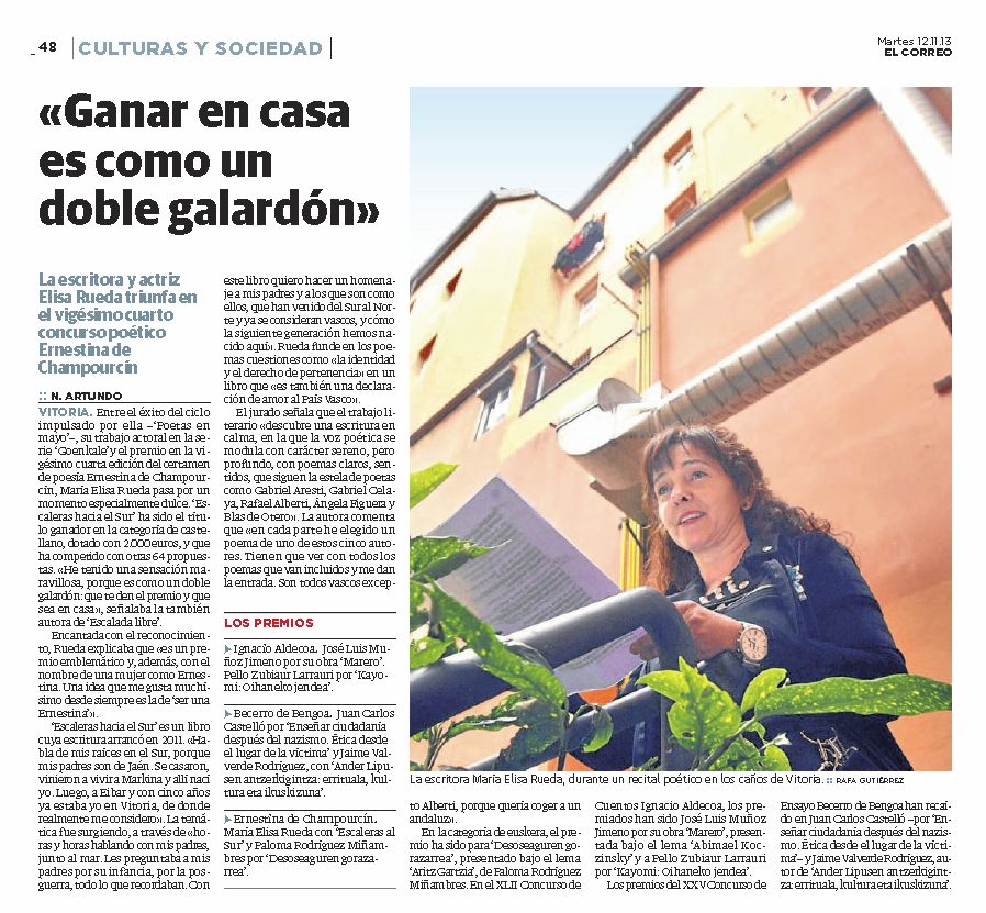 La escritora y actriz Elisa Rueda triunfa con 'Escaleras al sur' en el vigésimo cuarto concurso poético Ernestina de Champourcín. Entrevista en El Correo.