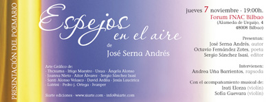 A las 19.00 h de hoy, presentarán el libro "Espejos en el aire" el poeta Octavio Fernández Andrés, el editor Sergio Sánchez Isasi y el propio autor José Serna Barrientos.