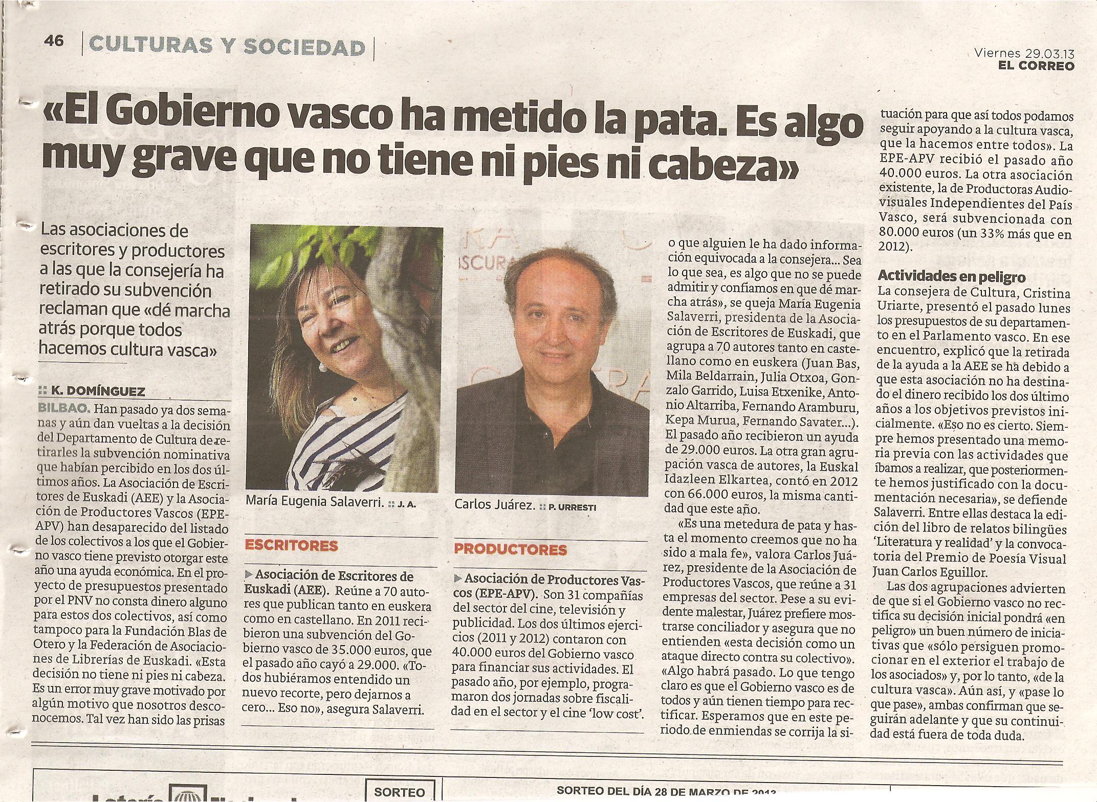 Noticia aparecida en la edición de hoy de El Correo, firmada por Koldo Dominguez en la que la presidenta de la AEE/EIE, Maria Eugenia Salaverri explica la posición del colectivo ante el recorte presupestario del departamento de Cultura.