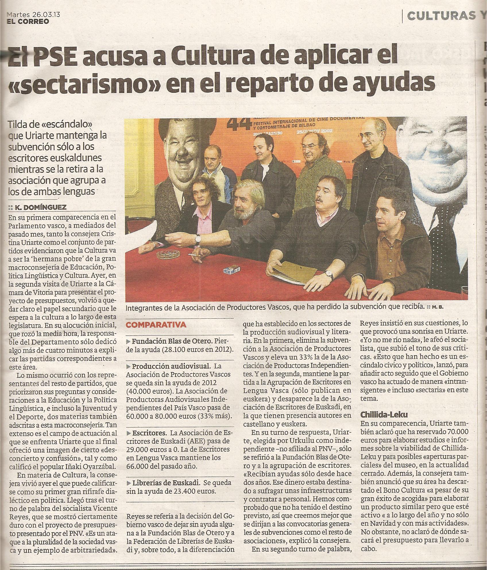 Reflejo en la edición de hoy de El Correo de la comparecencia de la Consejera de Cultura, Cristina Uriarte. La titular, además, de Educación y Política Lingüística hizo referencia a la nueva situación presupuestaria de la AEE/EIE.