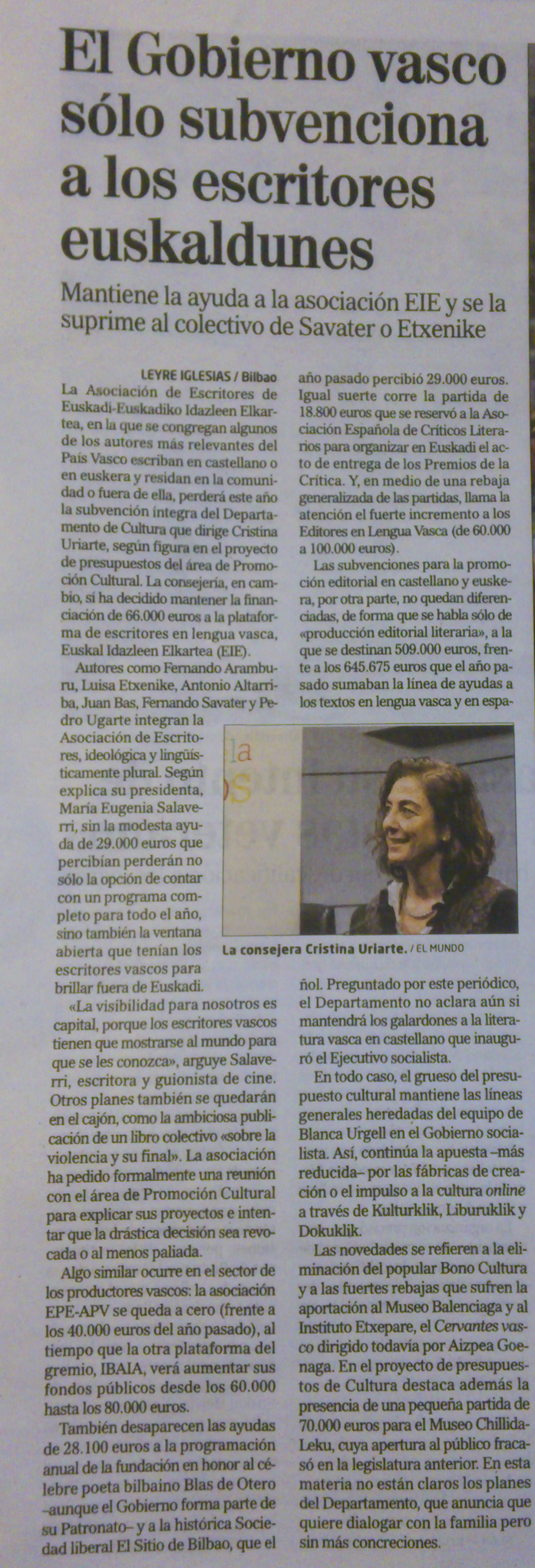 El diario El Mundo, en su edición de hoy, publica una información firmada por la periodista Leyre Iglesias sobre el presupuesto dedicado a cultura por el nuevo Gobierno Vasco. La presidenta de la AEE/EIE, Maria Eugenia Salaverri, participa en dicha información.