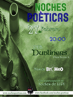 Y por último, a las 20:00 horas en el pub The Dubliners de la capital vizcaína, comenzará una nueva velada de Noches Poéticas. Apoyada esta vez por el colectivo poético LUPI, como músicos invitados estará Bromeo y Javier Triguero. Contarán con la presencia del polifacético artista Manuel Vicente Cajón y por supuesto, estarán los poetas y artistas habituales.
