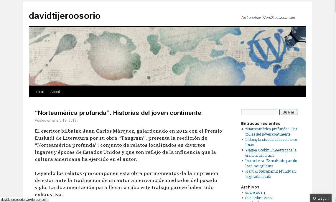 En la bitácora de David Tijero podemos encontrar muchos de los artículos, reseñas y críticas que publica regularmente en diferentes medios de comunicación. La variedad y el rigor componen esta serie de artículos siempre interesantes. Y como última entrada hasta el momento, el autor vasco entrevista en exclusiva al también escritor, también vasco y también socio de la AEE, Juan Carlos Márquez. A partir de su última publicación, 'Norteamérica profunda', ambos escritores hablan de literatura, de referencia y de últimos proyectos.