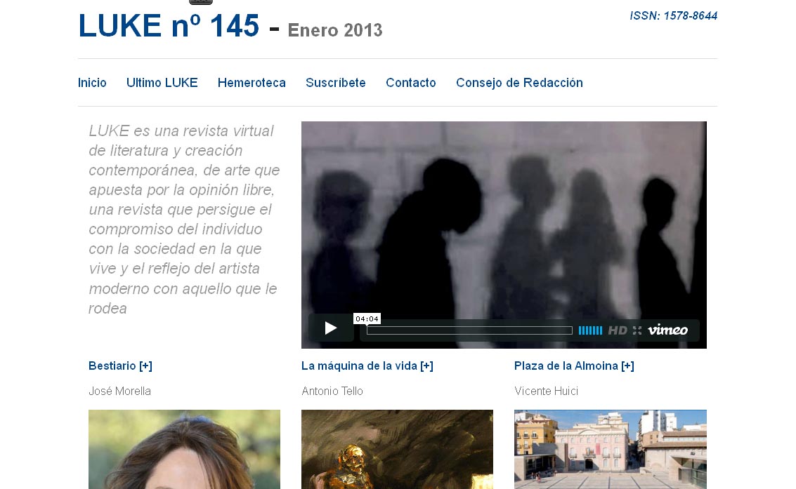 Ya está en ese kiosko enorme y global que es Internet un nuevo número de la revista cultural Espacio Luke. El proyecto, sostenido por Pedro Tellería, Kepa Murua y Ángel López de Luzuriaga, empieza un año más con un nuevo diseño. Este espacio cultural lo ocupa la poesía, la música, el cine y la opinión. Y para llegar a todos esos ámbitos cuenta con un nutrido grupo de colaboradores entre los que se encuentra Vicente Huici, Enrique Gutiérrez Ordorika o Alex Oviedo.