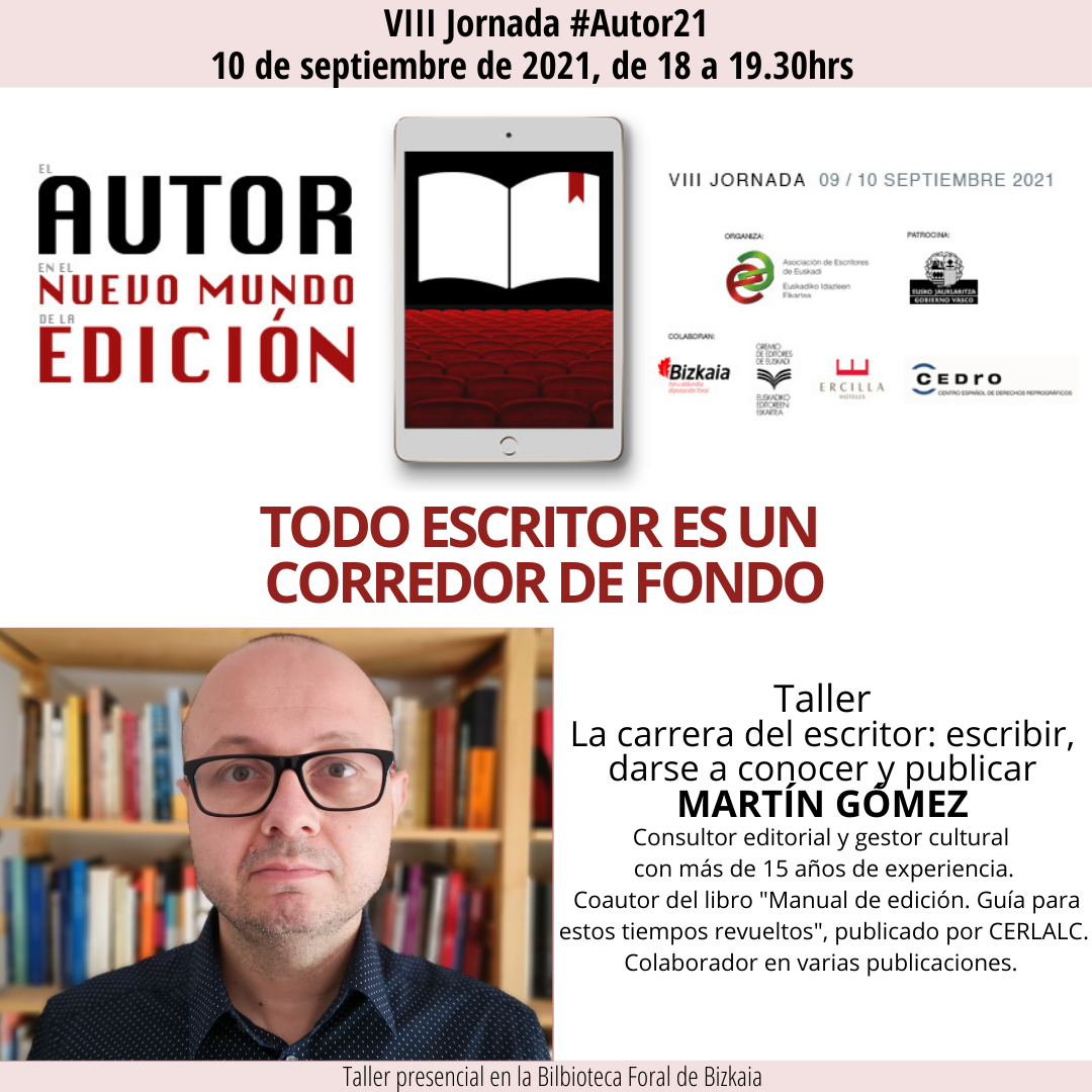 Martín Gómez ofrecerá el Taller: “La carrera del escritor: escribir, darse a conocer y publicar” con motivo de la VIII Jornada del autor el viernes, día 10 de septiembre de 18.00 a 19.30 h. Todos los talleres de la Jornada #Autor21 están patrocinados por Cedro.