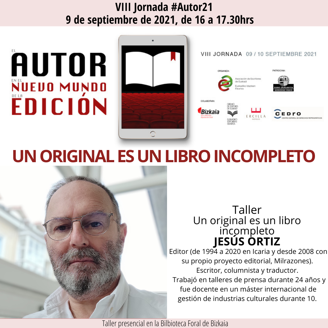 Jesús Ortiz ofrecerá el Taller: “Un original es un libro incompleto” con motivo de la VIII Jornada del autor el jueves, día 9 de septiembre de 16.00 a 17.30 h. Todos los talleres de la Jornada #Autor21 están patrocinados por Cedro.