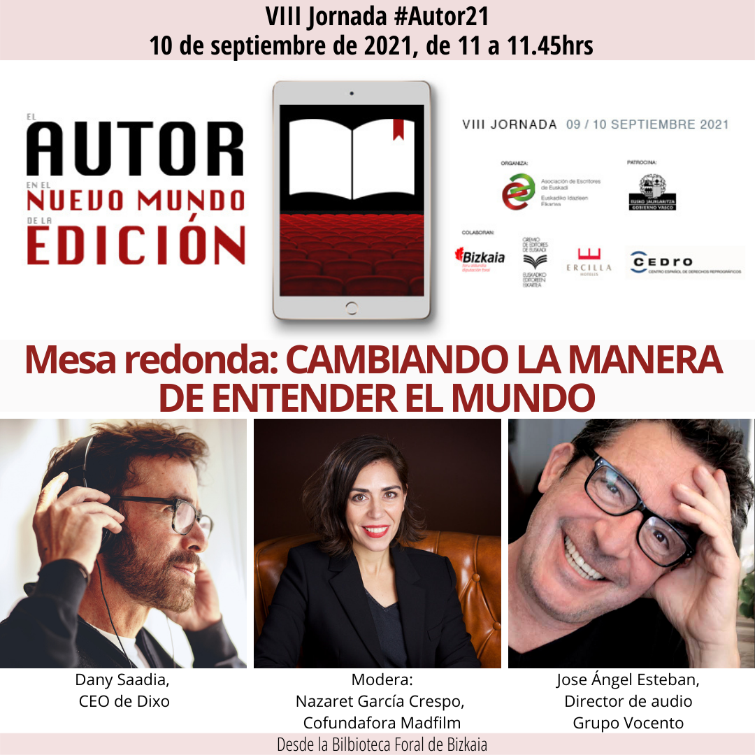 Con motivo de la VIII Jornada del autor el viernes 10 septiembre de 11.00 a 11.45 h. tendrá lugar el debate “Cambiando la manera de entender el mundo” con la presencia de los productores Dany Saadia, CEO de Dixo, y Jose Ángel Esteban de Osmos, director audio del Grupo Vocento, moderados por Nazaret García Crespo , cofundadora de Madfilm. En ella debatirán sobre los nuevos formatos sonoros y audiovisuales: audiolibros, podcast, series de tv, películas, etc., las apps aparecidas, las nuevas formas de contar las historias, los marcos normativos, los derechos de autor y todo lo que el mundo editorial ha traído de nuevo en la revolución digital .