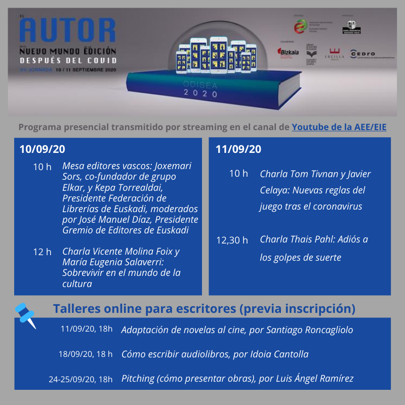 Estos talleres forman parte del programa de las VII Jornadas del Autor que organiza la Asociación de Escritores de Euskadi/Euskadiko Idazleen Elkartea (AEE/EIE), con el apoyo del Departamento de Cultura del Gobierno Vasco y con la colaboración de la Biblioteca Foral de Bizkaia, del Gremio de Editores de Euskadi y de Cedro.