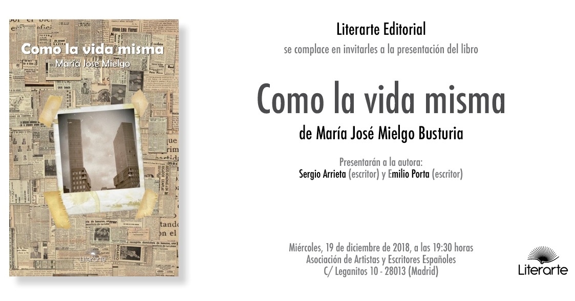 María José Mielgo presenta hoy en Madrid Como la vida misma de la editorial Literarte. El acto tendrá lugar a las 19:30 en la Asociación de Artistas y Escritores Españoles (C/ Leganitos, 10) y estará acompañada por los también escritores Sergio Arrieta y Emilio Porta.