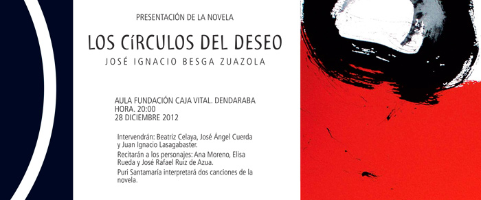 El escritor vitoriano Jose Ignacio Besga termina el año con un buen comienzo. El próximo viernes 28 de diciembre presenta su última novela. 'Los círculos del deseo' dará sus primeros pasos en un acto celebrado en el Aula Fundación Caja Vital de la capital vasca. En este acto especial, Besga estará acompañado de la también escritora y asociada Beatriz Celaya, el ex alcalde José ángel Cuerda y Juan Ignacio Lasagabaster. Además, la también asociada Elisa Rueda y Ana Moreno y José Rafael Ruiz de Azúa recitarán a los personajes que protagonizan la nueva obra de Jose Ignacio Besga. Y por último, Puri Santamaría interpretará dos canciones de la novela. Todo esto a partir de las 20:00 horas.
