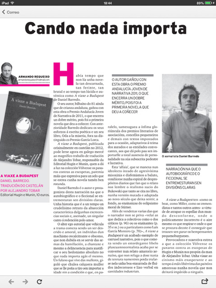 La editorial Hugin e Munin ha publicado la traducción al gallego de la novela de Daniel Barredo, 'El viaje a Budapest'. Como explica el autor,  "la traducción ha sido posible gracias a la apuesta personal del editor Alejandro Tobar, que leyó la novela en español y le gustó tanto la obra que decidió adquirir los derechos para publicarla en gallego. Para mí significa un importante estímulo, porque es un libro maravillosamente editado, con acabados de lujo, que va a permitirme contactar con lectores y escritores tan buenos como Armando Requeixo, autor de una reseña aparecida en la prensa gallega".