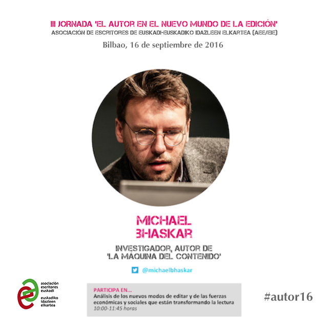 Como ya anunciamos el pasado mes de marzo, Michael Bhaskar pronunciará la conferencia inaugural de la III Jornada 'El autor en el nuevo mundo de la edición', que se celebrará el próximo 16 de septiembre en Bilbao a partir de las 10:00 h. Análisis de los nuevos modos de editar y de las fuerzas económicas y sociales que están transformando la lectura es el título de la misma.