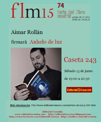 Aimar Rollán estará en la Feria del Libro de Madrid el sábado 13 de junio para firmar ejemplares de 'Anhelo de luz', publicado por Editorial Creación. La firma tendrá lugar en la caseta 243, desde las siete a las ocho y media de la tarde.
