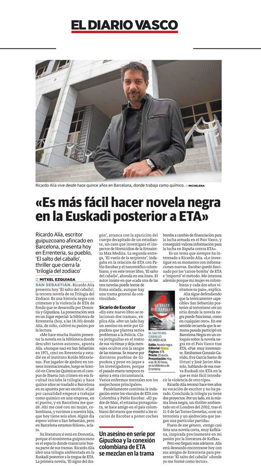 Ricardo Alía ha participado recientemente en el festival BCNegra formando parte de la mesa redonda "Euskadi o la violencia después de la violencia" en la que ha compartido espacio con otros autores vascos, como Gonzalo Garrido. El autor habla hoy en Diario Vasco tanto de la Trilogía del Zodíaco como de este evento. A la entrevista completa se puede acceder desde aquí.