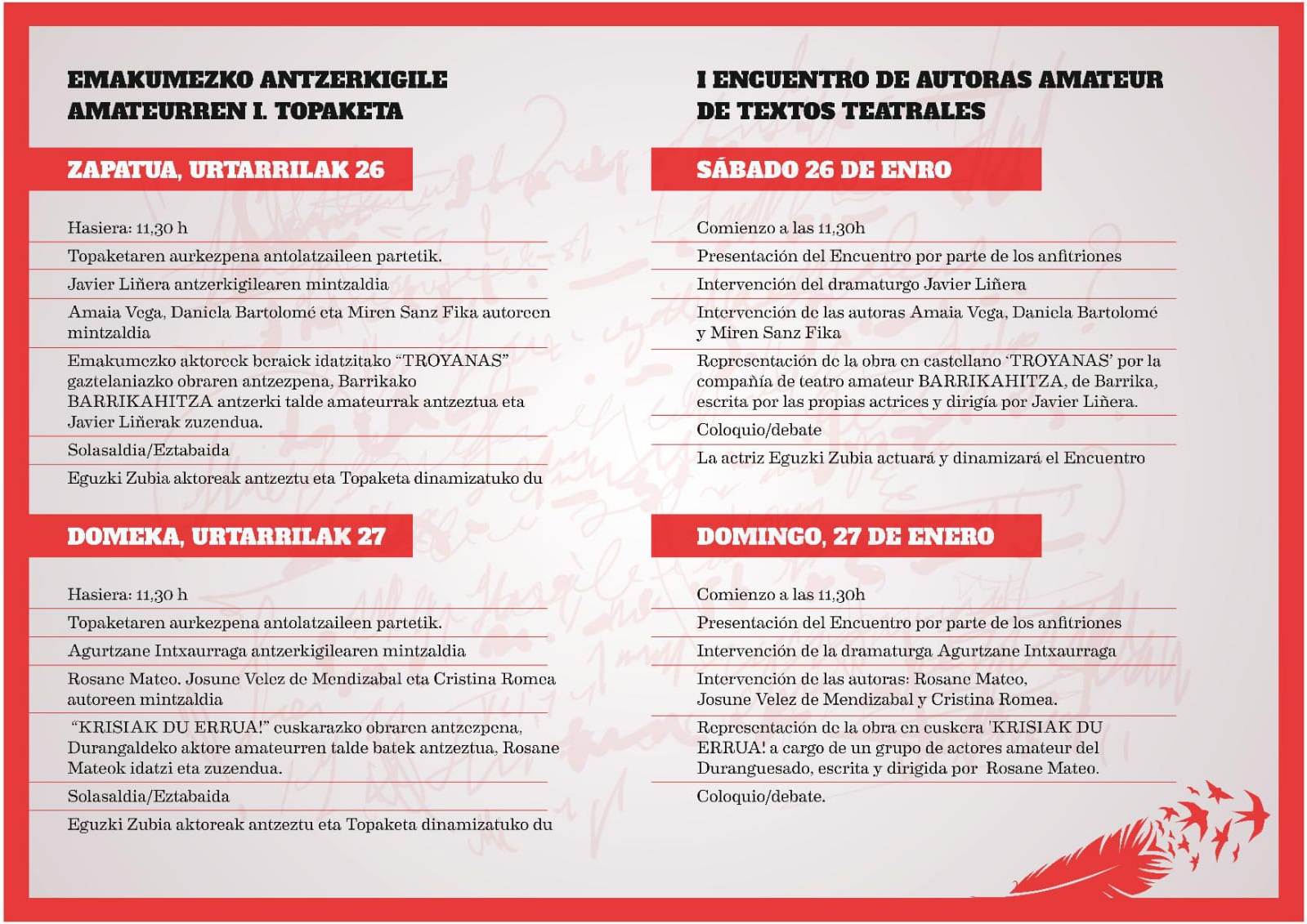 Creado e impulsado por Marieta Díaz de Toledo, este I Encuentro de autoras amateur de textos teatrales, surge con el objetivo de ofrecer a mujeres escritoras amateur de textos teatrales residentes en el País Vasco, la posibilidad de mostrar, exponer y difundir sus obras, así como potenciar su presencia desde perspectivas y ámbitos no profesionales.