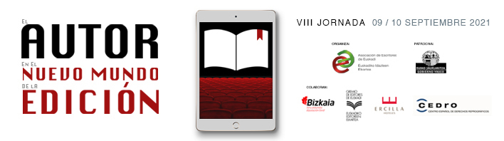 Las X Jornadas del Autor se han desarrollado en Bilbao durante los días 7 y 8 de septiembre, organizada por la Asociación de Escritores de Euskadi/Euskadiko Idazleen Elkartea (AEE/EIE) con el apoyo del Departamento de Cultura del Gobierno Vasco y con la colaboración de la Biblioteca Foral de Bizkaia, Sala BBK, Universidad de Deusto, del Gremio de Editores de Euskadi y de Cedro.