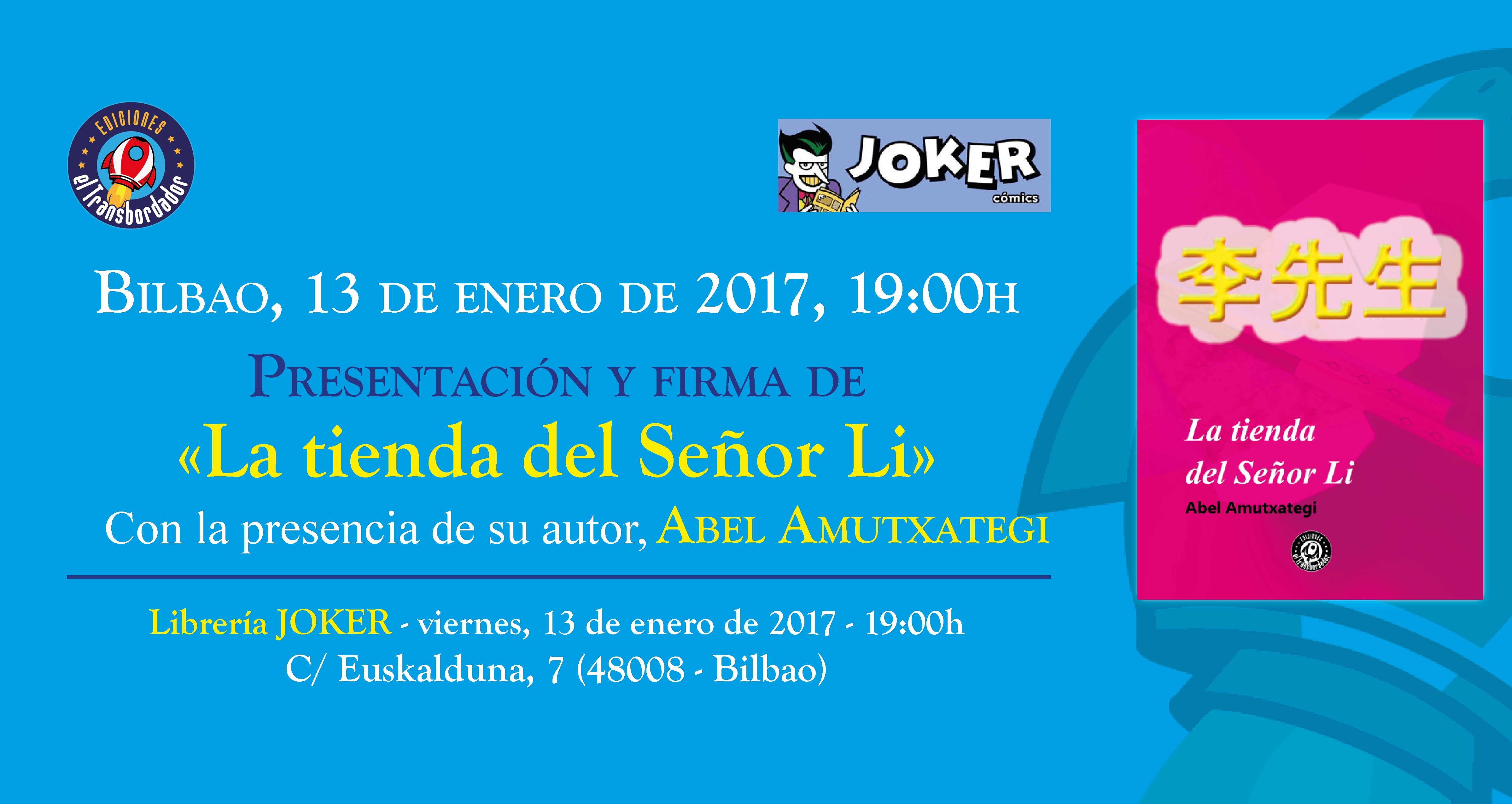 El próximo viernes, Abel Amutxategi inaugura la nueva temporada de presentaciones de la librería Joker de Bilbao a partir de las 19:00 h. con La tienda del Señor Li. La novela ha sido publicada por Ediciones el Transbordador y es una aventura divertida y delirante en la que el autor reflexiona sobre la importancia de la palabra.