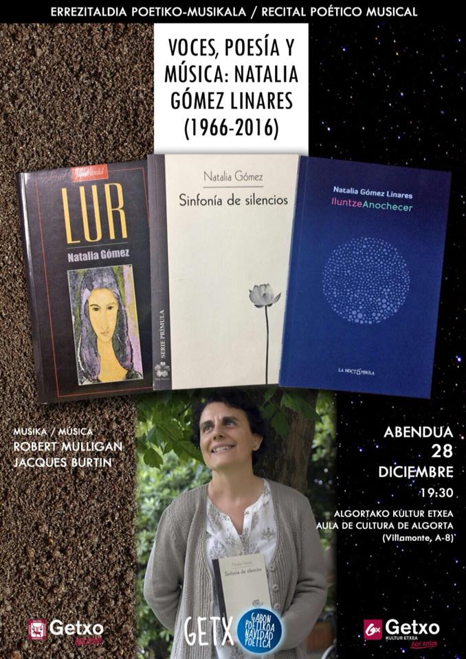 Esta tarde, a partir de las 19:30 h., tendrá lugar un recital poético como homenaje a Natalia Gómez Linares, fallecida en octubre de 2016. Para ello en el Aula de Cultura de Algorta se reunirán varias voces que recordarán a la poeta getxotarra a través de su obra. De este modo los asistentes podrán disfrutar de poemas de sus 3 libros: Lur, Sinfonía de silencios e Iluntze-Anochecer. El recital estará amenizado por la música de Robert Mulligan y Jacques Burtin.