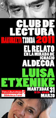 Hoy jueves 31 de marzo, a las 19:00 horas, la escritora Luisa Etxenike participará en una nueva edición del Club de Lectura que organiza la Biblioteca Foral de Bizkaia. En este caso, la autora donostiarra hablará sobre "El relato en la mirada de Ignacio Aldecoa". Os animo a que vengáis. Es en la quinta planta.