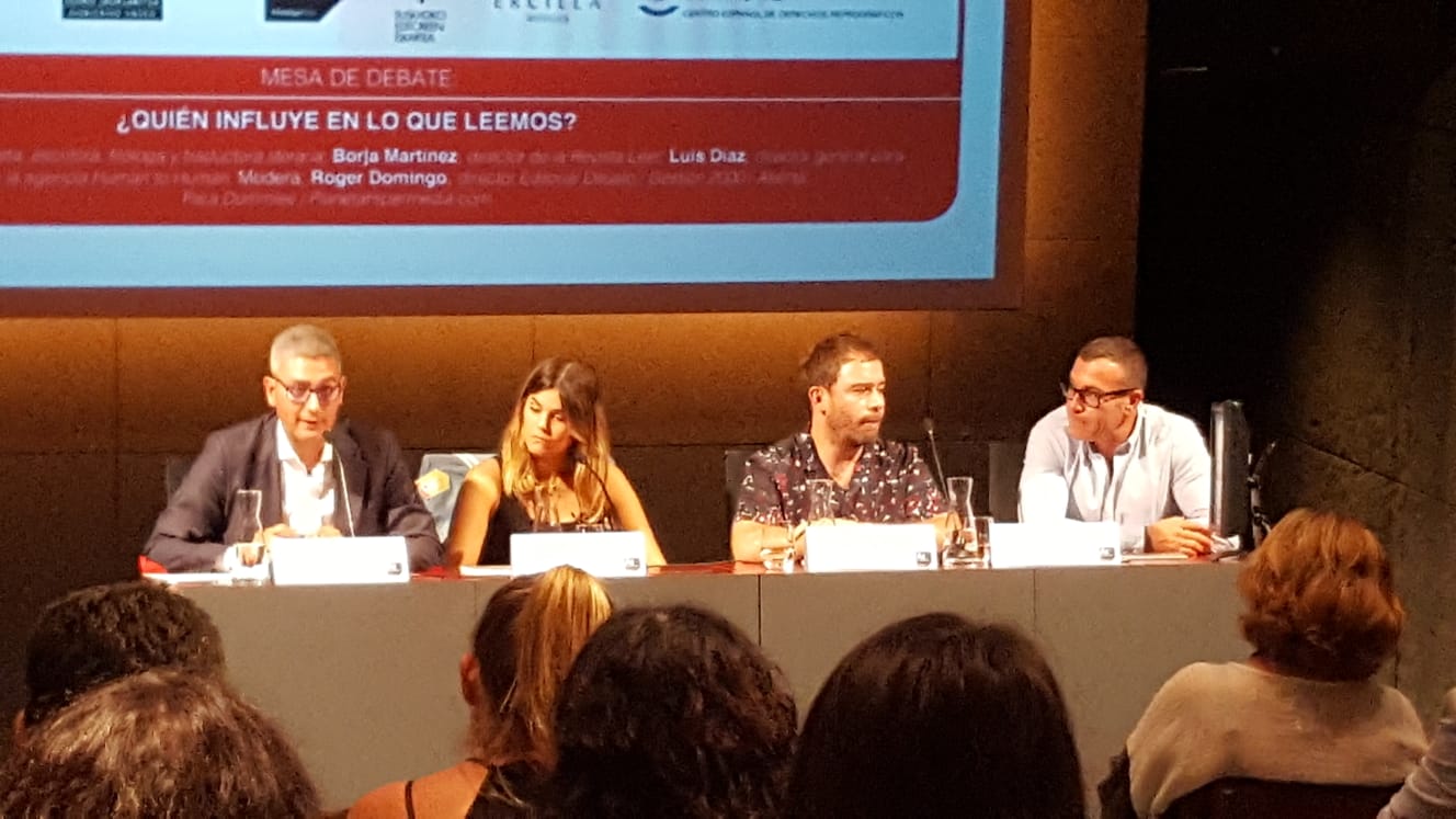 A continuación llegó uno de los momentos más esperados de la Jornada: conocer a Elvira Sastre, poeta, filóloga y traductora literaria, que se sentó junto a Borja Martínez, director de la Revista Leer, Luis Díaz, director general para España y Portugal de la agencia Human to Human. Hablaron sobre cuánto influye realmente un prescriptor en el criterio de los lectores. El editor Roger Domingo, director Editorial  de Deusto / Gestión 2000 / Alienta / Para Dummies/ PlanetaHipermedia.com, fue el encargado de moderar esta mesa sobre quién influye en lo que leemos y en defensa de la utilidad del marketing y los “influencers” como facilitadores del proceso de elección de lectura de un libro frente al cada vez más pequeño mundo de revistas literarias que basan su existencia en la reflexión pausada de los contenidos literarios y sus autores.