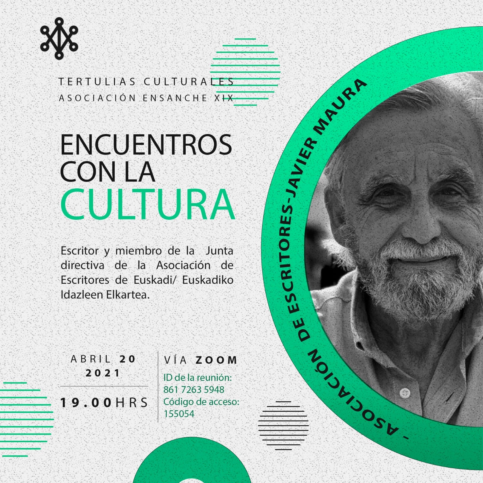 Datorren asteartean, apirilak 20, 19:00etan, Ensanche XIX Elkarteak antolatzen dituen Kultura Topaketen baitan Javier Maura, Euskadiko Idazleen Elkarteko, Zuzendaritza Batzordeko kideak eta Javier Otaola, Ensanche XIX Elkarteko kide eta AEE/EIEko Batzordekidea denak ere, online bidezko elkarrizketa egingo dute.