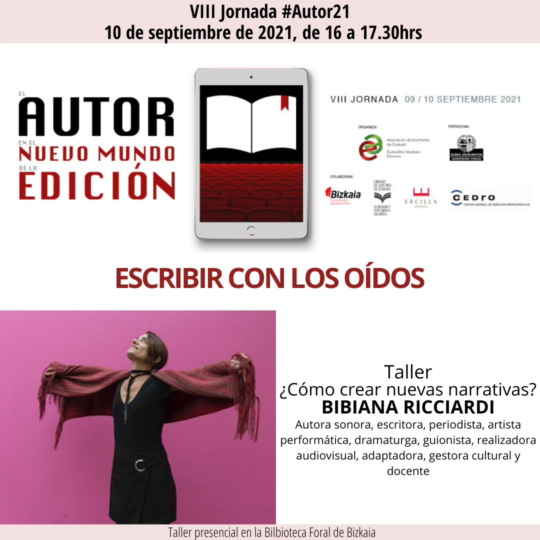 Bibiana Ricciardik “Nola sortu narratiba berriak?” tailerra eskainiko du VIII Egilearen Jardunaldiaren baitan, ostiralean, irailak 10, 16:00etatik 17:30etara. Ricciardi entzunezko edukien sortzailea, idazlea, kazetaria, artista performatikoa, dramagilea, gidoilaria, ikus-entzunezkoen errealizatzailea, egokitzailea, kultura kudeatzailea eta irakaslea da. #Egilea21 Jardunaldiko tailer guztiak Cedrok babestuak dira.