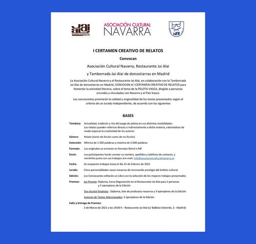 Nafarroako Kultura Elkarteak eta Jai Alai Jatetxeak Madrileko donostiarren Jai Alai Danborradarekin elkarlanean I Kontakizunen Sormenezko Lehiaketa antolatu dute.