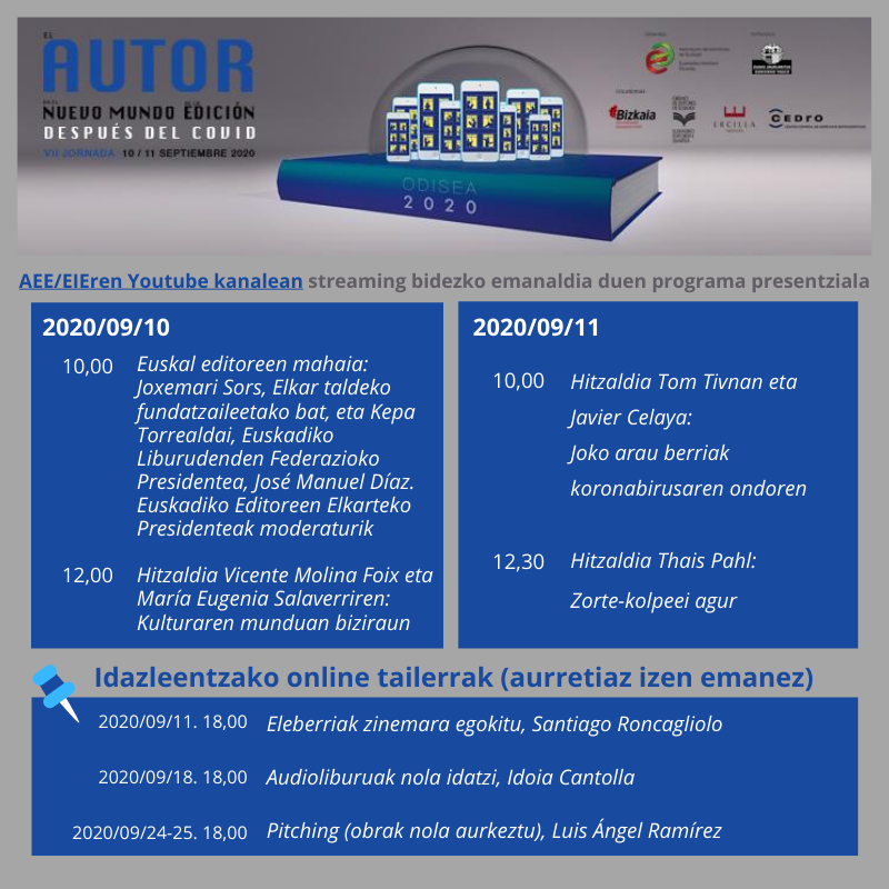 Jardunaldiak streaming bidez emango dira, AEE/EIErenYoutube kanalaren eta Bizkaiko Foru Liburutegiaren kanalaren bitartez.