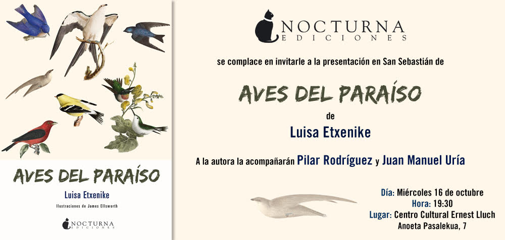 Datorren asteazkenean, urriak 16, Luisa Etxenikek Aves del paraíso (Nocturna Ediciones) bere azken eleberria aurkeztuko du Donostiako Ernest Lluch Kultura Zentroan 19:30etan. Pilar Rodríguez eta Juan Manuel Uría gure kideak ere egongo dira berarekin.